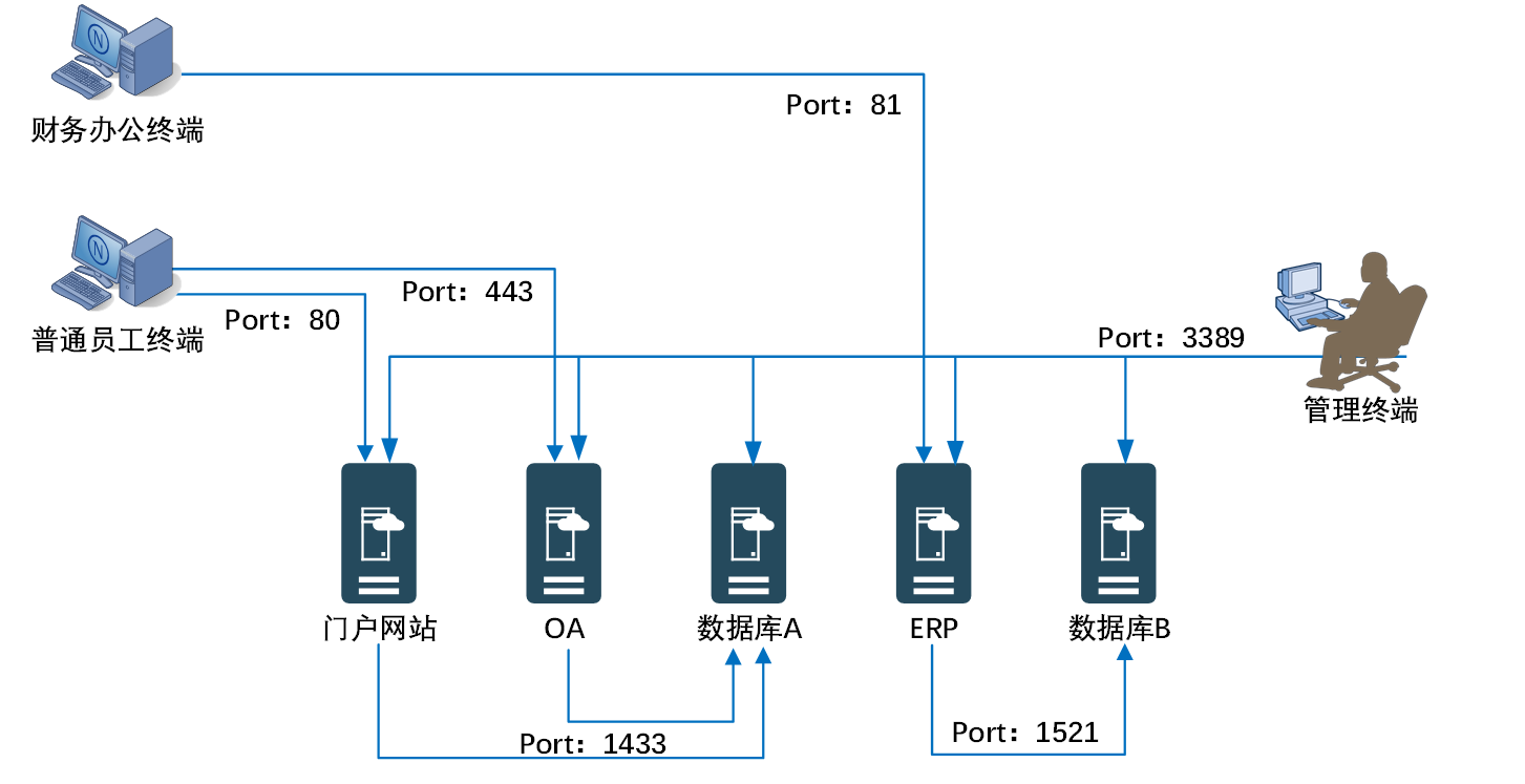 还是用以前发的一张图来说明,在建立了微隔离的环境中,服务器的3389端口早已被限制到很小的权限,只有管理终端有权限可以访问,其他任何主机都不允许访问。因此,3389端口并不是任何人都可以访问的。