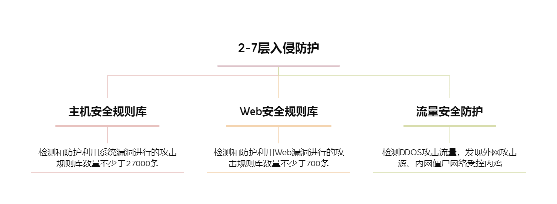 2-7层入侵防护可以深入理解应用协议和数据,从而更精准地检测和防范安全威胁。还可以有效识别主机层、应用层等威胁,提供更全面的安全保护。传统安全加固在实时监测方面受到限制,2-7层入侵防护有庞大的规则库,可以实时监测流量如DDOS攻击等,发现外网攻击源、内网僵尸网络受控肉鸡。