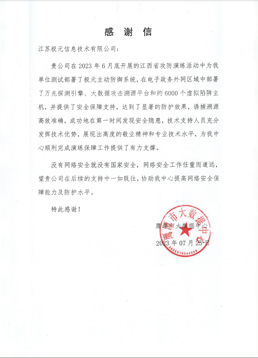 鹰潭市大数据中心向欧乐影院 发来感谢信