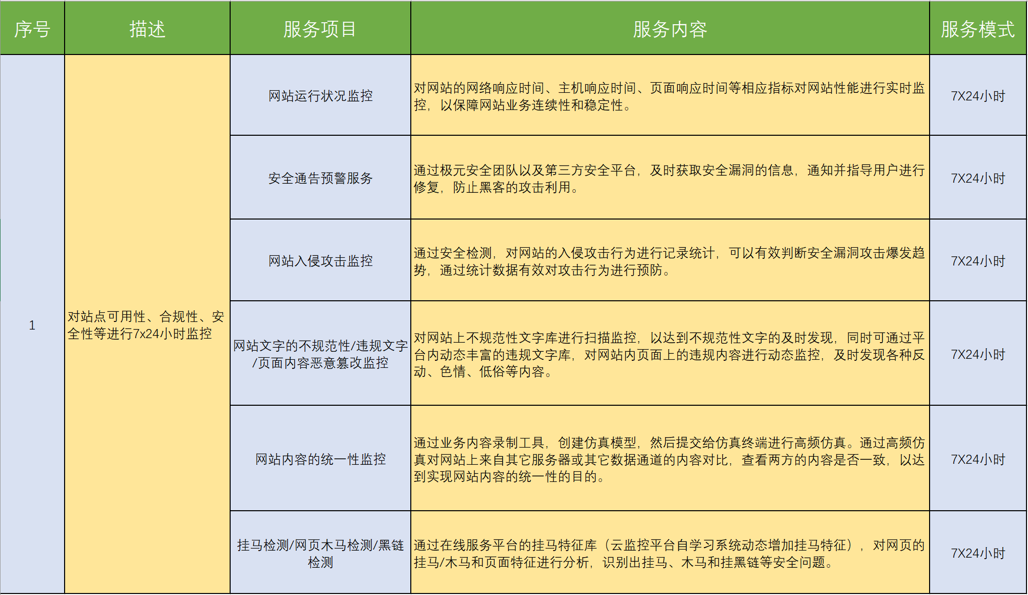 为客户提供网站入侵攻击检测、网页挂马检测、网页篡改检测、敏感关键字内容检测、网站实时流量监测、网站备案监测,并能够对严重安全攻击提供邮件报警功能,以及可以定期出具安全监测报告。在重大会议或敏感时间段提供全面监测服务,为保障客户声誉与网站安全稳定运行提供强有力支撑。