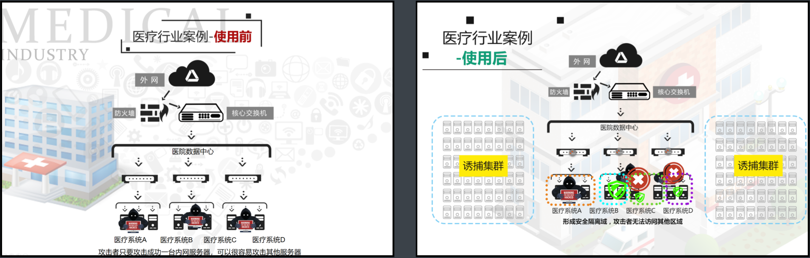 使用Oxtrea SwitchWALL可以对内网形成多个安全隔离域,可以减少内网索病毒大面积 发作的范围。同时通过全息诱捕功能,一旦发现内网中勒索病毒等恶意程序将立刻对来源进 行阻断并告警。